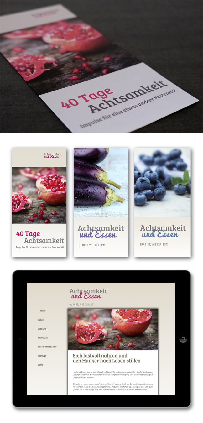 Zur Veranstaltungsreihe „Achtsamkeit und Essen“ gestalteten wir Flyer zu verschiedenen Seminaren sowie die Website, auf der man unter anderem das aktuelle Kursangebot einsehen kann.