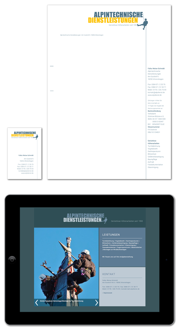 Die Firma „Alpintechnische Dienstleistungen“ bietet Arbeiten in großer Höhe an, ohne dass ein Gerüst aufgebaut werden muss. Wir überarbeiteten das bestehende Logo, setzten eine kleine Website um und entwarfen die Geschäftsausstattung (Briefbogen und Visitenkarte).