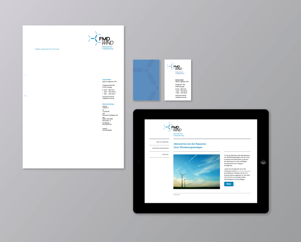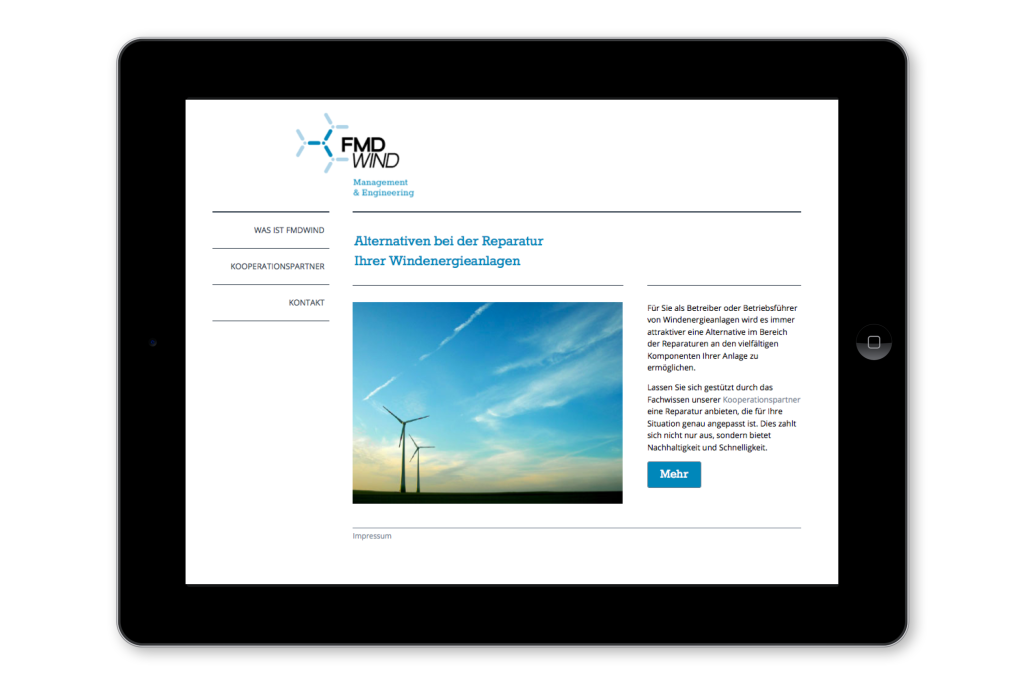 FMD WIND bietet für Reparaturen von Windkraftanlagen Speziallösungen, in Zusammenarbeit mit Fachunternehmen und Kooperationspartnern an. Wir gestalteten das Erscheinungsbild der Firma sowie ihre Website.