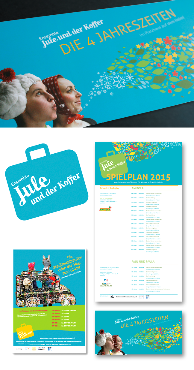 "Jule und der Koffer" ist ein komödiantisches Theater für Kinder, das buchstäblich "aus dem Koffer", also mobil auftritt. Auf künstlerisch hohem Niveau, mit viel Humor und Poesie werden Märchen und Geschichten erzählt und die Zuschauer ab zwei Jahren einbezogen. quasigrafik gestaltete das Erscheinungsbild sowie die Programmflyer.