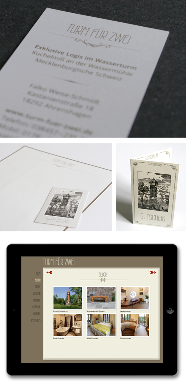Ein ehemaliger Wasserturm in Mecklenburg steht zur Miete bereit – in Höhe der Baumwipfel verteilen sich ca. 70 m² über 4 Etagen, inklusive Küche, Kamin, Balkon und Badewanne. Wir gestalteten das Erscheinungsbild, welches in Form einer Website, von Visitenkarten, einem Briefkopf und einem Flyer nach außen tritt.